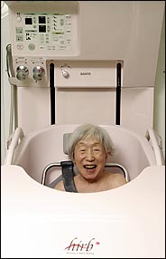 "The temperature is just right — the bubbles are really comfortable," she said, happily sealed up to her neck inside the Sanyo Electric Company's latest elder care product. Turning to an attendant hovering around the pink, clamshell-shaped "assisted-care bath," she asked, "May I have a bit more water, please?"
