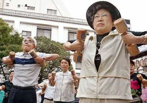 Senior citizens workout with wooden dumb-bells outside a temple in Tokyo to mark Japan's Respect for- the-Aged Day.