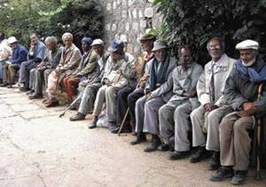 Elderly men wait for food at Michael’s House in Addis Ababa, Ethiopia.